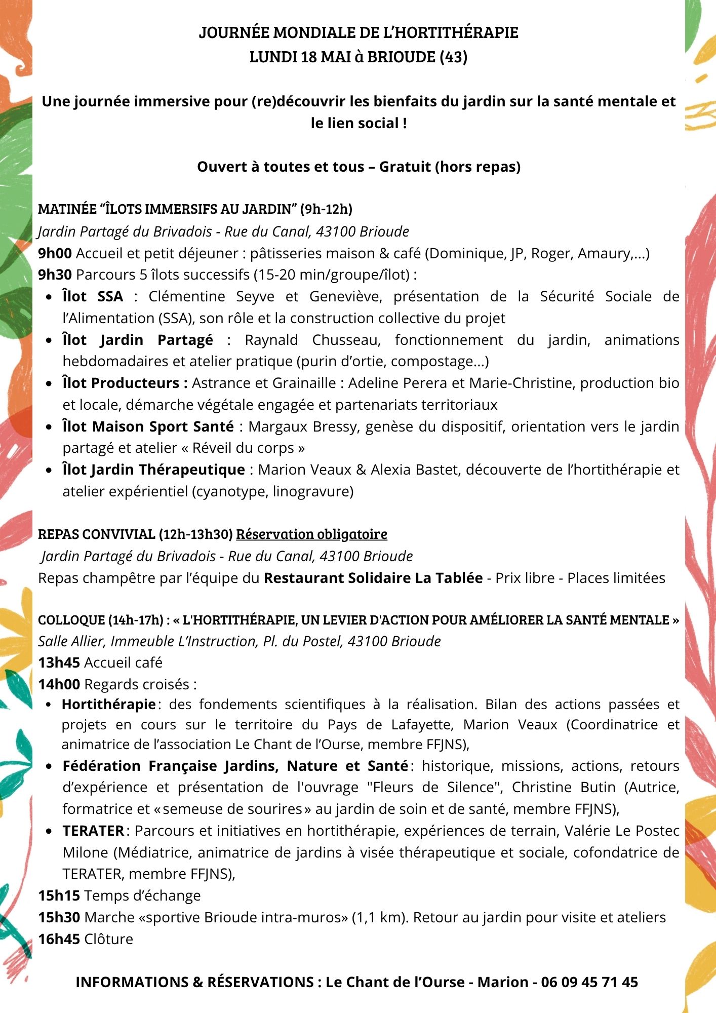 Dans le cadre de la Journée mondiale de l'hortithérapie, l'association Le Chant de l'Ourse a le plaisir de vous inviter à une journée d'échanges et de pratiques autour du jardin comme levier de santé mentale, de lien social et de bien-être, le lundi 18 mai 2026 à Brioude (43).